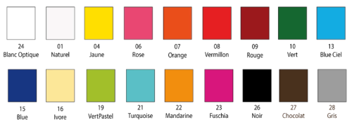 | Kleur | antraciet 29 antracite, antraciet 29 sneeuwwit 24 / antracite 29 blanc neige 24, blauw 15 / bleu 15, blauw 15 geel 04 / bleu 15 jaune 04, blauw 15 sneeuw wit 24 / bleu 15 blanc neige 24, chocolade 27 / chocolat 27, fuchsiarose 23 fuschiarose, gebroken wit 01 blanc cassé, geel 04 / jaune 04, grijs 28 / gris 28, groen 10 / vert 10, groen 10 vermiljoen 08 / vert 10 vermillon 08, ivoor 16 / ivoire 16, licht blauw 13 bleu ciel, licht blauw 13 gebroken wit 01 / bleu ciel 13 blanc cassé 01, licht blauw 13 geel 04 / bleu ciel 13 jaune 04, mandarijn 22 / mandarine 22, oranje 07 / orange 07, pastel groen 19 / vert pastel 19, rood 09 / rouge 09, rood 09 gebroken wit 01 / rouge 09 blanc cassé 01, rose 06 sneeuw wit 24 / rose 06 blanc 24, sneeuw wit 24 blanc neige, turquoise 21 / turquoise 21, vermiljoen 08 / vermillon 08, vermiljoen 08 geel 04 / vermillon 08 jaune 04, vermiljoen 08 groen 15 / vermillon 08 vert 15, vermiljoen 08 wit 24 / vermillon 08 blanc 25, zwart 26 / noir 26 |